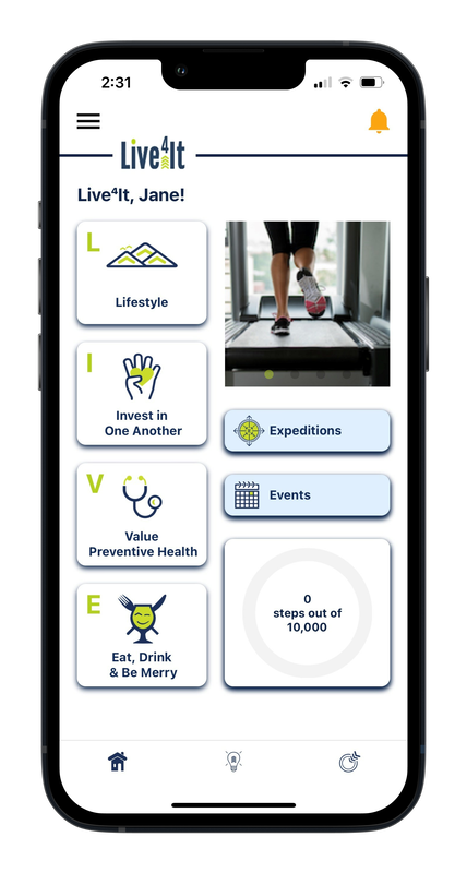 Live⁴It offers a unique health and wellness journey by creating one goal and one message to provide opportunities to identify what is important to you (your “It”), participate in Expeditions, share recipes, attend social events, and engage in mental health tools. Live⁴It to live a longer, healthier life… Your Health. Your Journey. Your “It”.